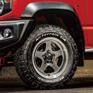 太く、存在感のある5本スポークにアクセントとして「RAYS」と「57」の文字が刻印されている。57FR-Xを象徴するようなアイコニックなポイントであり、足もと全体を目立たせるアシストとなる。オンロード、オフロード問わずいかなるシーンにもジムニーをマッチさせる秀逸な設計で肉厚なリムを薄くすることで強度を保ちつつ、軽量化も実現している。