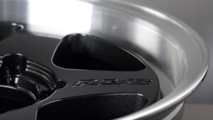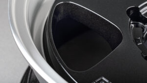 スポーツスタイルを演出するなら細身のスポークが鉄板であるが、グラムライツは、あえて太くさせることで無骨な5本スポークを選択。オン、オフ問わず幅広く走破可能なジムニーシリーズにスポットをあてることで剛性に長けた太めのスポークデザインに仕立てられている。57FR‐XにはRAYS初となるフロントリム部にRCF(レイズ・キャスト・フローフォーミング)が採用されている。これはリムを圧延しながら成形することで素材のポテンシャルを引き出しつつ、内部構造強化を可能とする技術だ。肉厚なリムを薄くしながら強度を維持することで軽量化と強度を両立する高度な作りによって、ジムニーの持つ性能を引き出す優れたホイールと言えるだろう。