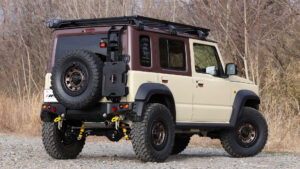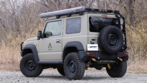 リヤウインドーの破損防止となるリヤゲート用ガードも発売中。キャンプなどのアウトドアで使うと重宝するストレージパネルの役割も兼ねている。なお、ジムニーノマドにも対応するマイナーチェンジモデルも5月下旬に登場を予定している。