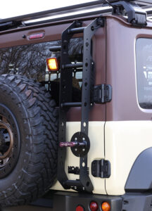 後方視界を遮ることなく、さらに強度を追求するために極厚の4㎜アルミプレートとマルパイプを組み合わせたジムニーシリーズ専用のリアラダー。オプションのマウントを使用することで、POTOPAXのホルダーやIPFの600Sシリーズの装着もできる。
