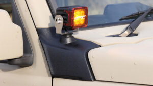 ARBのサミットバンパーに交換し、中央部にIPFのエクストリームLEDスポーツ900XLSを装着。アンバーのレンズカバーを追加することで、フォグランプと色味を合わせている。またピラーには、IPFのS-632とランプステーをセットにした、Dice製ロータリードライビングパネルも装着。