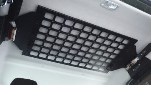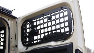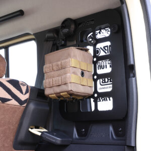 ジムニーとシエラのサイドウインドーを確実に保護するサイドストレージパネル。角穴と丸穴の開いたパネルによりモールシステムに対応した小物ケースやポーチの固定が可能。写真のように様々なスタイルにアレンジして使うことができる。