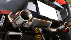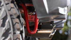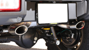老舗マフラーメーカーの5ZIGENと共同開発した、ピストンウィッツのオリジナルマフラー。スポーティな左右出しのレイアウトを採用するが、リヤバンパーよりもテールエンドを奥に配置したり、クリアランスを確保するために真円ではなくオーバル形状のテールピースを採用するなど、至る部分にオフロード性能を低下させない配慮がなされている。もちろん保安基準をしっかりクリアしているので、車検に適合した合法的なチューニングパーツと言える。