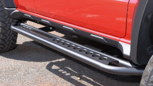 ノーマルのサイドシルを外しスリムサイドシルパネルに交換するだけで、乗降性が飛躍的向上。素材は塗装が不要なAES樹脂なので、ノーマルパーツと交換するだけという手軽さもポイント。サイドステップを装着する場合でも高い位置にセットできるので、オフロードでのクリアランスを拡大することができる。ちなみにピストンウィッツが推奨するのは、ハイブリッジ1stのロックスライダールックサイドステップだ。