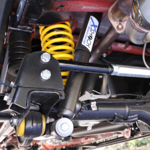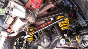 足回りはオリジナルのスプリングにショウワガレージのショックを組み合わせ、2.5インチリフトという絶妙な高さを実現。ステアリングダンパーも強化されているので、ワインディングでも安定した走りが楽しめる。