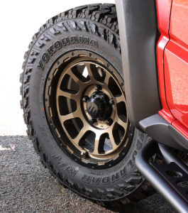 ジオランダーM/T G003(225/75R16)に、MIDのパーシングを組み合わせるが、マットブロンズ・リムバレルブラックのカラーリングは、ピストンウィッツのオリジナル。鮮やかなブロンズが足元に軽快さを与えるが、外周部分のブラックが引き締める役割を果たしており、4WDらしい力強さも感じさせてくれる。