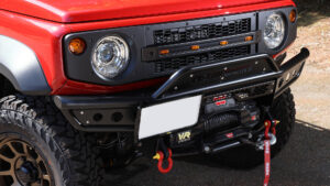 ウインチが搭載できる、特注のフロントバンパーType3を装着。強度を追求した設計なので通販は行っておらず、店頭での販売のみとなる。ちなみにグリルはAPIOの製品だが、異なるブランドを組み合わせても違和感を感じさせないところがピストンウィッツの審美眼の高さと言える。