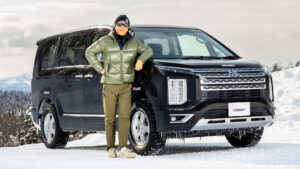 九島辰也氏とBFGオールテレーンKO3を装着した試乗車のデリカD:5中期型。