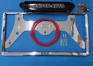 JB23/33/43用。リアゲート内側からステーを出し、上方を両面テープで固定する、穴あけ不要のナンバー土台。外れたりばたついたりはなく、しっかりと固定できる。ナンバー灯はプラスチックボディのLEDナンバー灯。14.300円(税込) ブラック枠は+550円(税込)