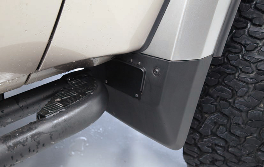 GRJ76用。社外ステップに交換した時のフロントマッドフラップのステップ逃げ穴のカバー。取付けは要穴あけ。アルミ製ブラックアルマイト。5,500円(税込)/左右セット