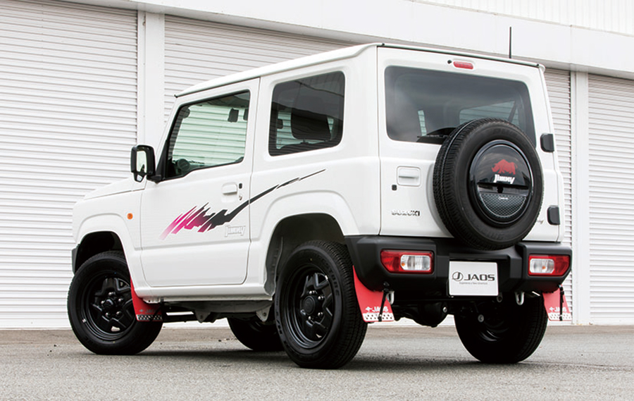 ジムニー(JB64) 18.07-用。カラー:レッド。マッドガードフロント左右、ハンガーベルト(ブラック)左右、ハンガーベルトプレート左右。マッドガード:EVAシート、ハンガーベルト:PP、ハンガーベルトプレート:アルミ。14,300円(税込)