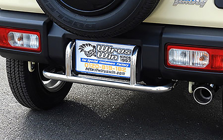 JB64用。SUS304ステンレス材で、38mm径と32mm径パイプを組み合わせて製作。エアロパーツほど主張せず、さりげないカスタムに最適。鏡面バフ仕上げ。ウイルズウィン製マフラーおよび純正マフラーに干渉しない。20,000円(税込)