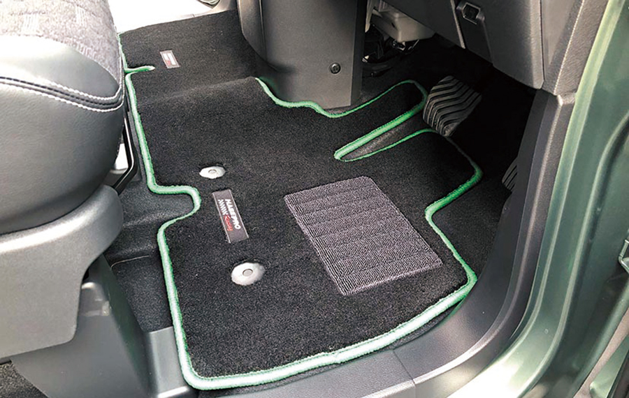 B38Aデリカミニ用。高級感あるマット織の厚みと。毛足の長さでボリュームある重厚感を演出。縁取りのロック糸のカラー選択が可能。HASEPRO RACING刺繍エンブレム前席左右装着、インテリアメイクに欠かせないフロアマット。国内生産で1枚ずつ縫製してお届け。21,780円(税込)